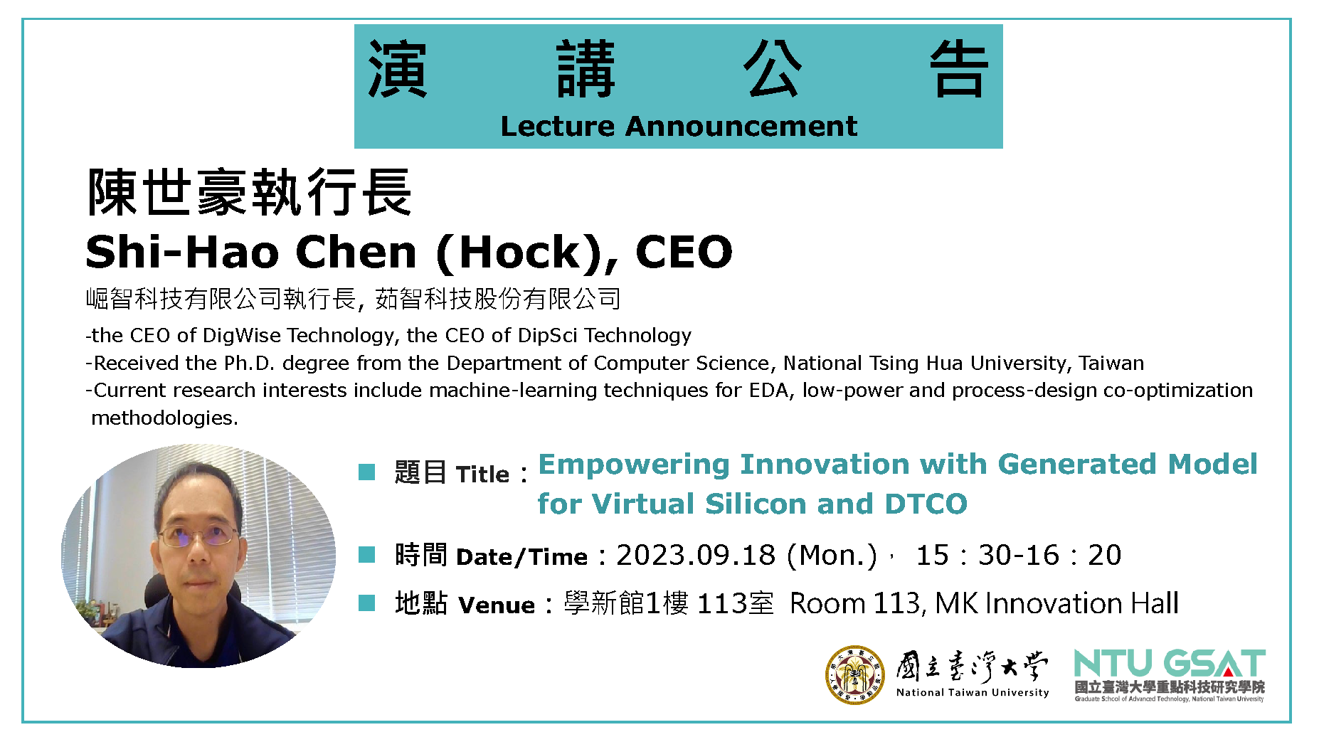 Shi-Hao Chen (Hock) is currently the CEO of DigWise Technology, a solution provider for best energy efficiency, and the CEO of DipSci Technology, a solution provider that provides on-chip process monitoring and machine learning technologies to improve productivity.